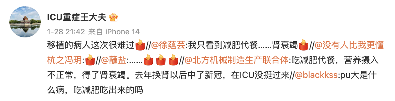 據微博帳戶「北方機械製造生產聯合體」披露:(肖雲)吃減肥代餐,營養攝入不正常,得了腎衰竭。去年換腎以後中了新冠,在ICU沒挺過來。