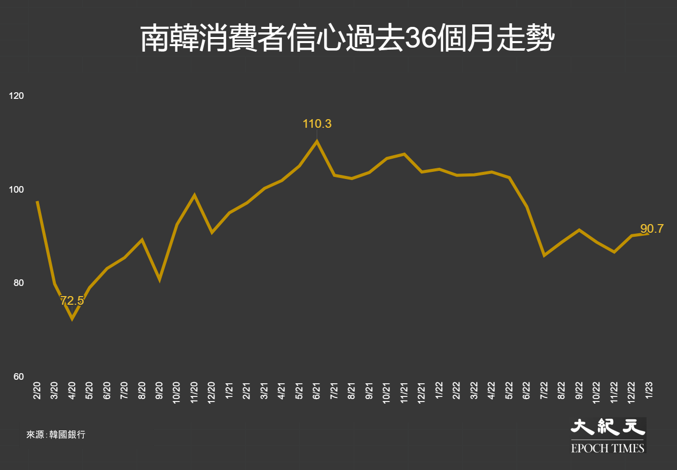 南韓銀行(Bank of Korea)於日前公布最新消費者信心指數(Consumer Confidence Survey Index,CCSI)從12月的90.2點上升至1月的90.7點。CCSI的最高值為200,最低為0,而100是中位數,較高即屬「樂觀」,較低便是「悲觀」。