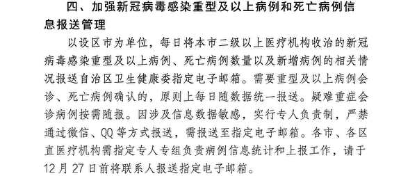 值得注意的是,文件特別強調保密:專家組會診意見不能擅自公開。感染重型及以上病例、死亡病例數量等,「因涉及信息數據敏感,實行專人負責制,嚴禁通過微信、QQ等方式報送,需報送至指定電子郵箱」。