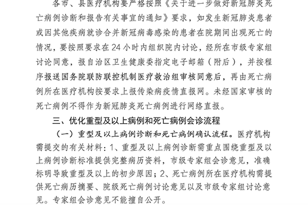 其中,就新冠死亡病例診斷和報告,文件要求,對於新冠患者或因其它疾病合併新冠病毒感染的患者在院期間出現死亡,要在24小時內完成院內討論,「經所在市級專家組討論同意,報自治區衛生健康委指定電子郵箱,並按程序報送國務院聯防聯控機制醫療救治組審核同意後,再由死亡病例所在醫療機構按要求上報傳染病疫情直報網。」「未經國家審核」的死亡病例不得作為新冠肺炎死亡病例進行網絡直報。