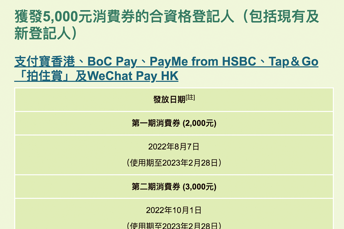 至於以Tap & Go、PayMe、BoC Pay、支付寶香港和WeChat Pay登記領取消費券的市民,若他們在去年8月7日獲發2,000元,以及在10月1日獲發3,000元消費券,其消費券將會在2月28日到期,未使用的金額將會在期滿後失效。@