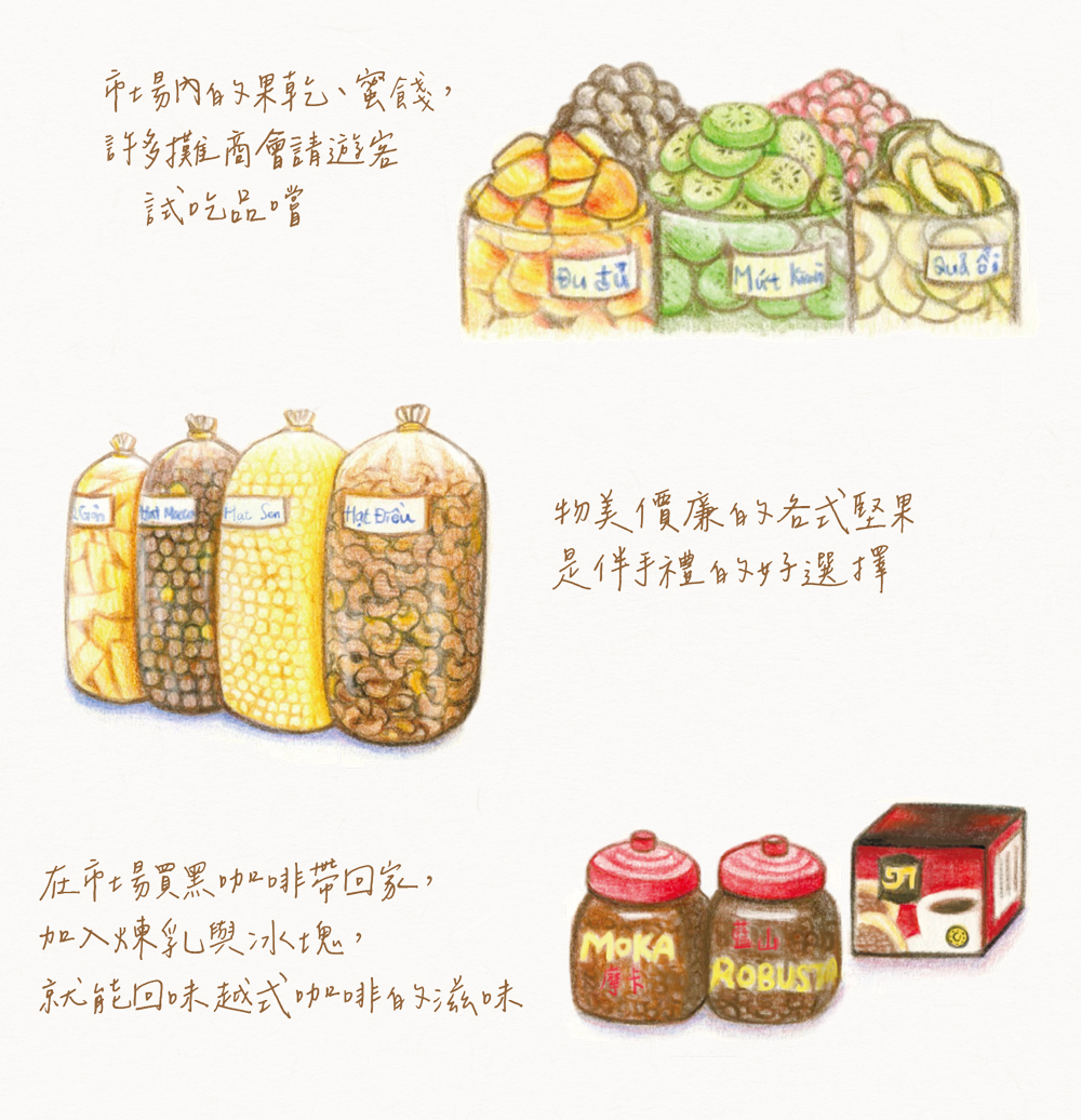 舊市場地下室的攤商都非常親切,我們最常去的是許多台灣朋友推薦的明珠腰果(MINH CHÂU)。店家販賣的咖啡、腰果、茶葉、綠豆糕和果乾種類齊全又新鮮,不僅價格合理,老闆娘還會熱情的請客人試吃各種零食,不用擔心踩雷。