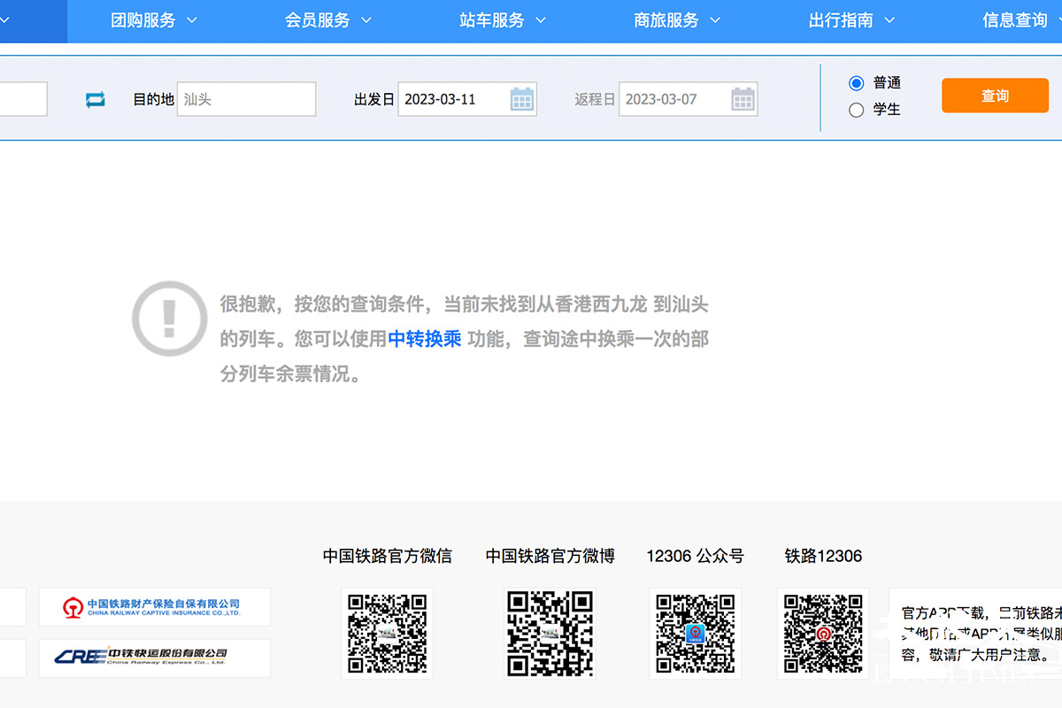 翻查大陸的「12306」購票網站,3月12日僅有一個高鐵班次,於當日下午2時12分在西九站開出,預料當日下午5時4分到達汕頭站。