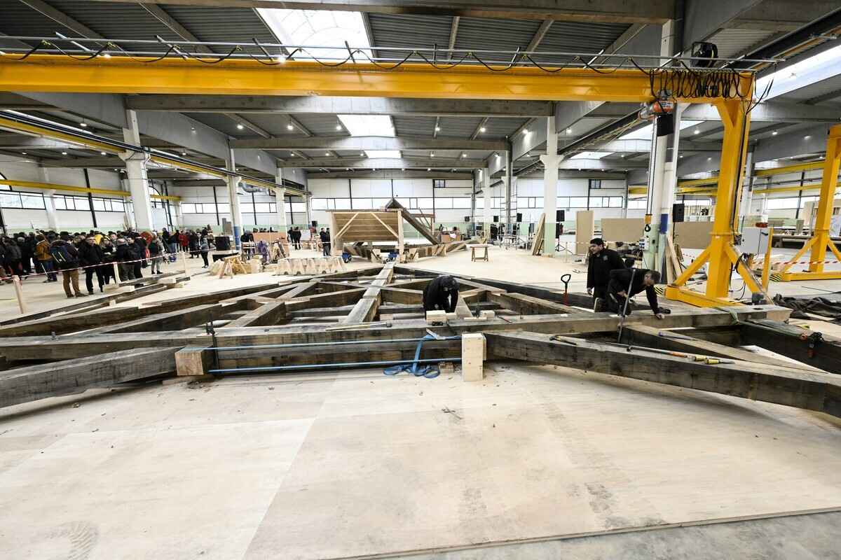 2019年當時大火造成巴黎聖母院的尖頂坍塌,部份木質屋頂燒燬。目前工匠們在布里埃進行為期兩天的塔尖底座組裝工作,目的是確保基座的各種組件在巴黎聖母院屋頂正式組裝時能夠正確裝配在一起。