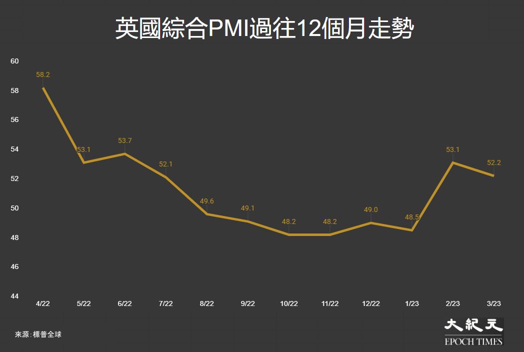 標普全球今天(24日)公布最新英國綜合PMI(採購經理指數)初值,3月份錄得52.2,相比上月53.1有所減弱,唯仍高於50的榮枯線,反映景氣處於擴張狀態。