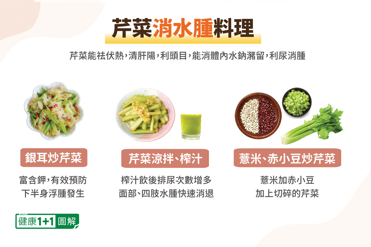 1.銀耳炒芹菜:銀耳屬真菌類食物,可調節機體免疫功能。芹菜含豐富纖維素及鉀元素,可以透過促進小便消除水腫。