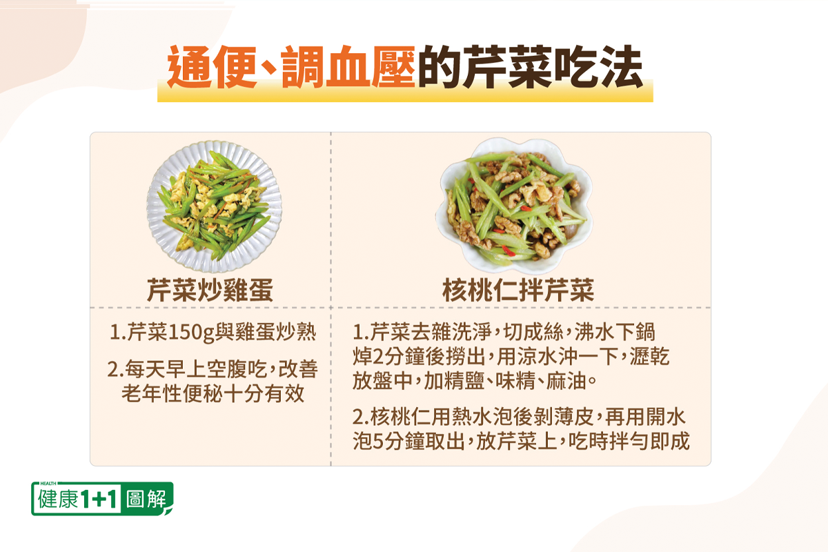 1.芹菜炒雞蛋:芹菜150克和雞蛋一起炒,特別適合年長者便秘、大便乾燥及排便困難等情況。