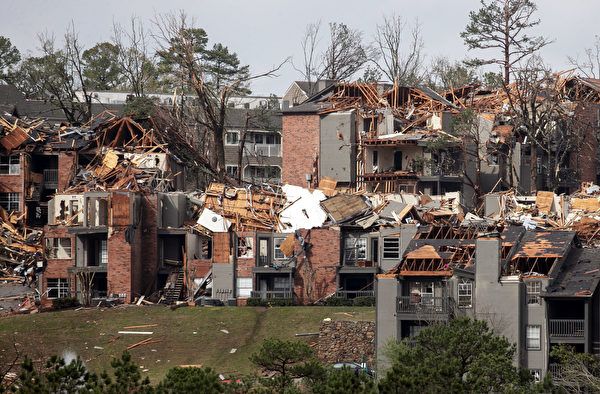 阿拉巴馬州和密西西比州以及阿肯色州小石城附近的暴風雨也造成了周五晚上至周六的多人死亡,該市官員表示,龍捲風所過之處,有逾2,600座建築物受到影響。