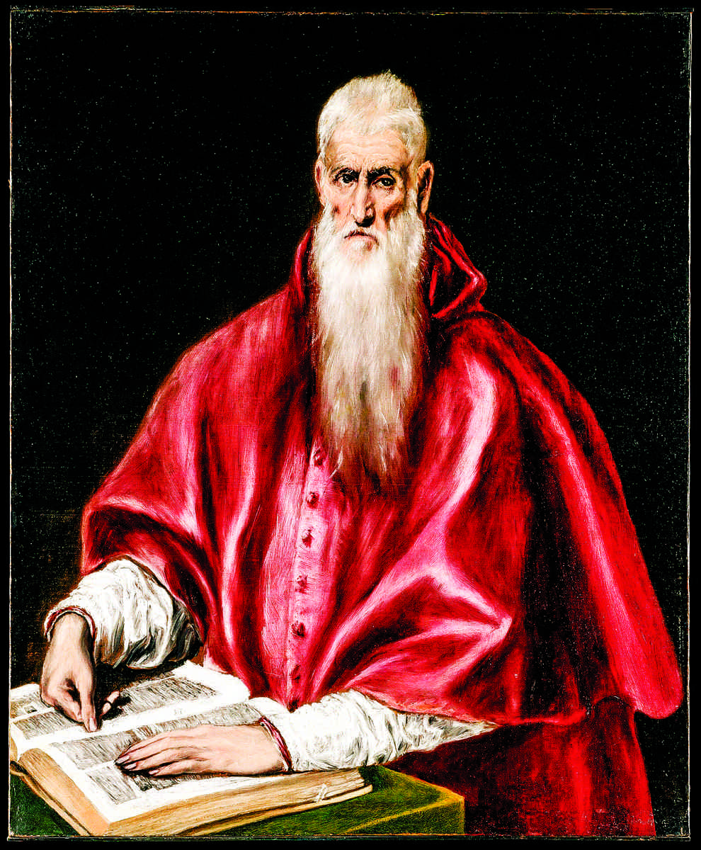 一進起居廳房最先看到的是三張畫,左右對稱畫中人物面對面,中間隔著一個壁爐,壁爐的上端掛的是十七世紀西班牙畫家葛雷哥(El Greco)的聖傑梅(Saint Jerome)畫像。聖傑梅身著樞機主教桃紅色的袍子,手持經卷,兩頰凹陷,一個苦行僧的形象。傑梅是四世紀的羅馬人,自我放逐在沙漠中翻譯經書,把希臘文、希伯來文譯成拉丁文,三十年不曾離開這個工作崗位。譯經時的傑梅仍未被認可,帶著罪人的身體,在沙漠中苦行譯經。後來他譯的版本為教廷所用,那件桃紅色的袍子是藝術家加上去的。