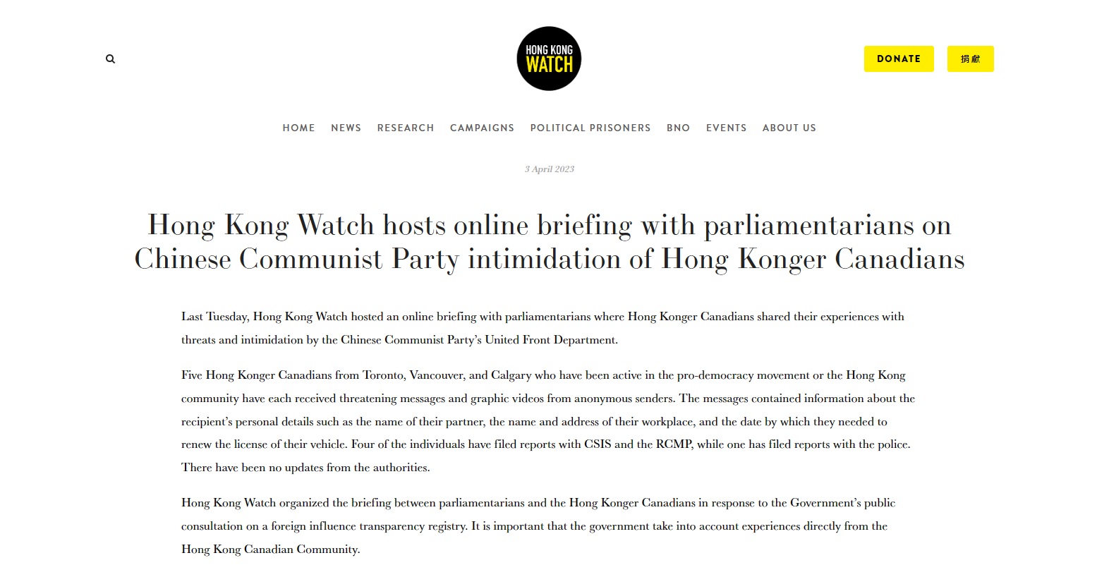 加拿大聯邦政府正就設立外國代理人登記制度展開公眾諮詢,香港監察上週二舉辦網上簡報會,讓香港加拿大人親自向國會議員講述被中共統戰部威脅和恐嚇的經歷。5名來自多倫多、溫哥華和卡加利的香港加拿大人一直積極參與民主運動或香港社區事務,曾各自收到匿名恐嚇信息和恐怖分子斬首人質的血腥暴力影片。這些信息含有收件人的個人資料,例如伴侶姓名、工作名稱和地址及續領車輛牌照最後限期。其中4人已向加拿大安全情報局(CSIS)和加拿大皇家騎警(RCMP)報案,1人已報警,惟均未獲進一步跟進。
