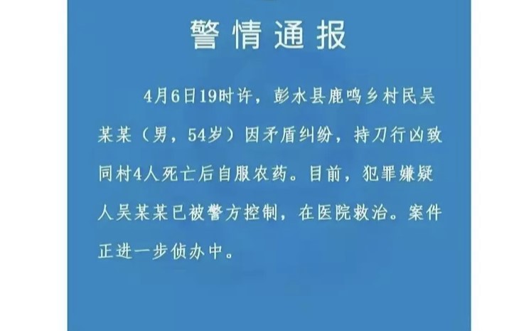 據重慶彭水縣警方官方微博4月7日通報,6日晚間7時許,彭水縣鹿鳴鄉村民吳某某(男,54歲)因矛盾糾紛,持刀行兇致同村4人死亡,之後自服農藥。吳某某正在醫院救治。