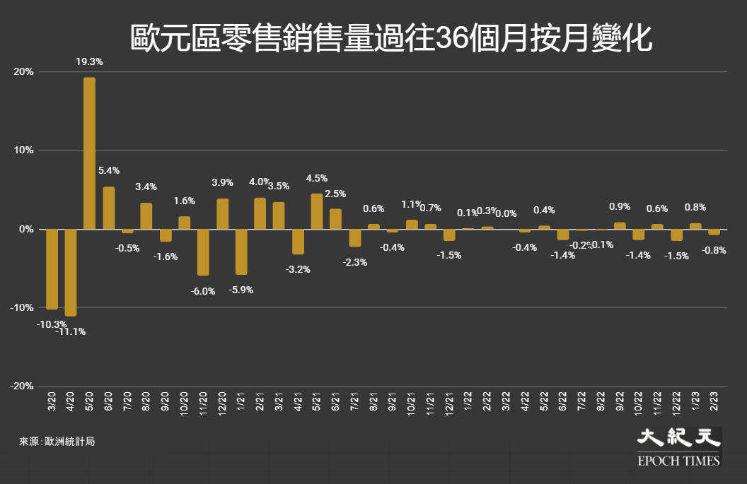 歐洲統計局(Eurostat)於當地時間4月11日,公布最新經季節與工作天調整的零售業銷售初值統計數字,2月份銷售量指數按月錄得下降0.8%,市場預測跌0.8%,上月報升0.8%;若以銷售額計算,則下降0.2%。2月銷量相比上一年同月走低3.0%。