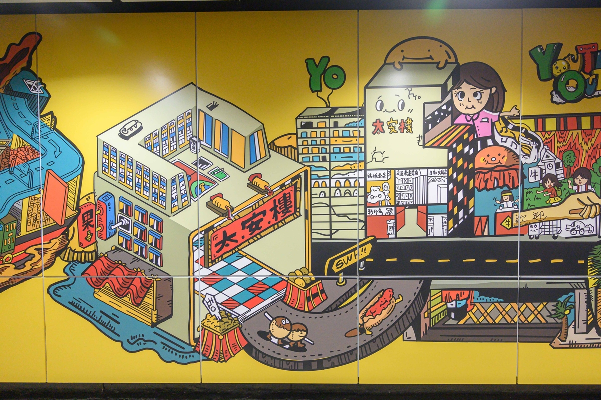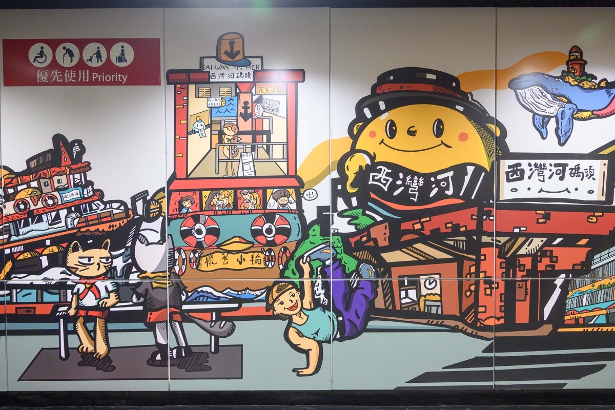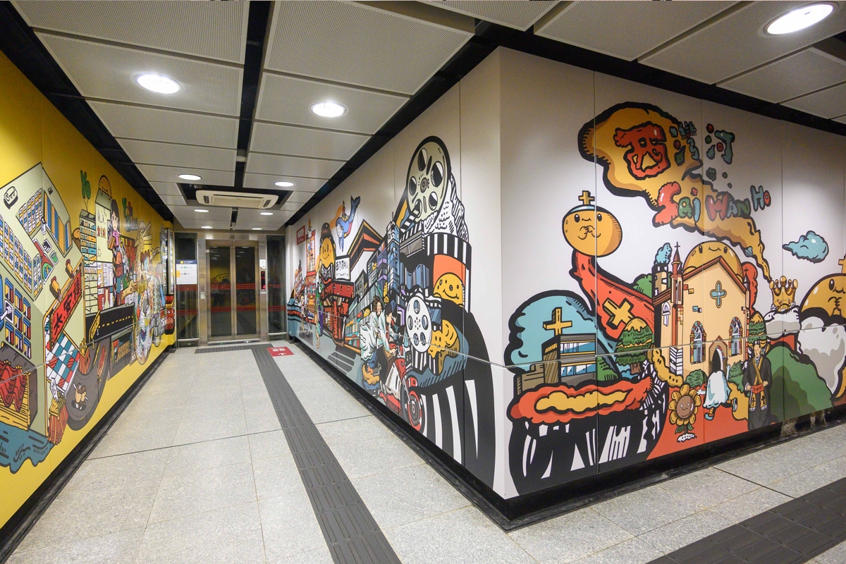港鐵西灣河站昨日(11日)起添上新裝,在站內加上多幅藝術創作,描繪當區特色,乘客可以在在西灣河站車站及地面升降機大堂看到。