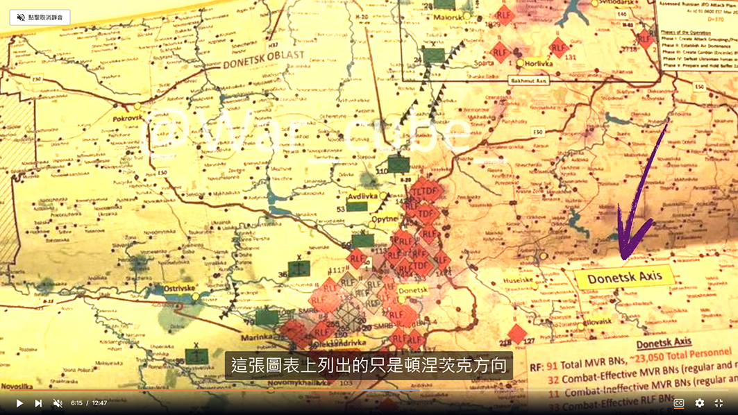 在這張圖的右下角列出了頓涅茨克方向俄羅斯的總兵力,大概23,000人。而烏克蘭的人數要更少一點,總共部署了8個旅,有10,000到20,000人,可以看到由南向北分別是第110旅、第53旅、第59旅、第36海軍陸戰隊,還有馬林卡附近的第70旅。