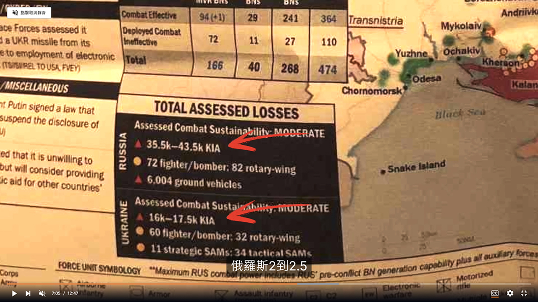 網上還流傳了另外一個版本,應該是俄羅斯情報機構偽造的,在這個版本中,俄羅斯的陣亡人數在16,000到17,500,而烏克蘭的陣亡人數,在60,000到70,000人之間。這張圖表還顯示,俄羅斯只損失了9駕飛機、8架直升機。這不簡直是開玩笑嗎?俄羅斯確認被擊落的蘇-35可能就有好幾架了,怎麼可能只損失9架固定翼飛機,而卡-52(直升機)已經被擊落超過20架,這些都是有圖片和影片為證的。所以關於俄羅斯的損失,這一塊兒是明顯有嚴重錯誤的,很明顯網上流傳的這個圖是俄羅斯偽造了數字。