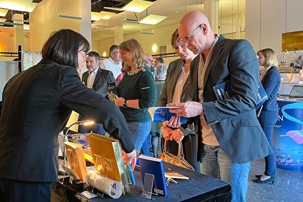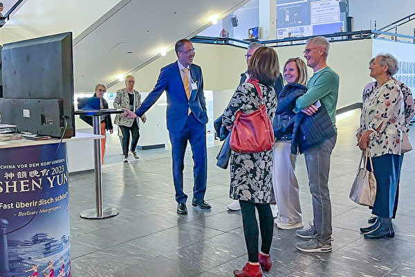 不少觀眾在現場購買法輪功的書籍《轉法輪》,有的購買了法輪功徽章準備別在衣服上。一對夫婦在兩年前購買神韻票後,因疫情原因那個城市一直沒有演出,沒想到,神韻熱線的義工打電話告訴他們達姆施達特的演出信息。這對夫婦表示要感謝神韻,感謝所有的工作人員。「你們不僅僅在舞台上表現美好,你們真的是在生活和工作中身體力行,我們要從心裏表示感謝。」