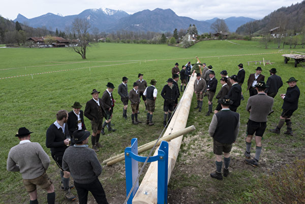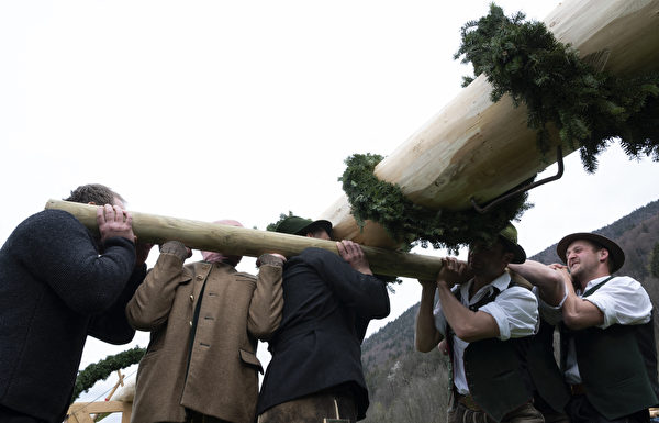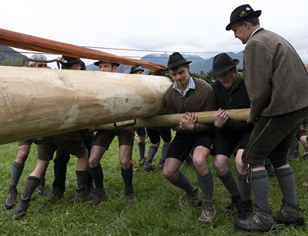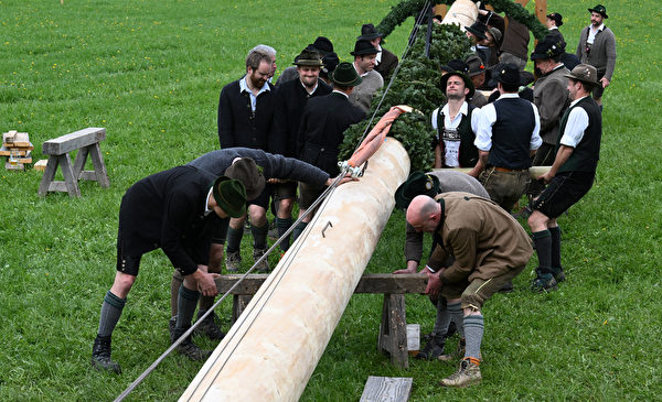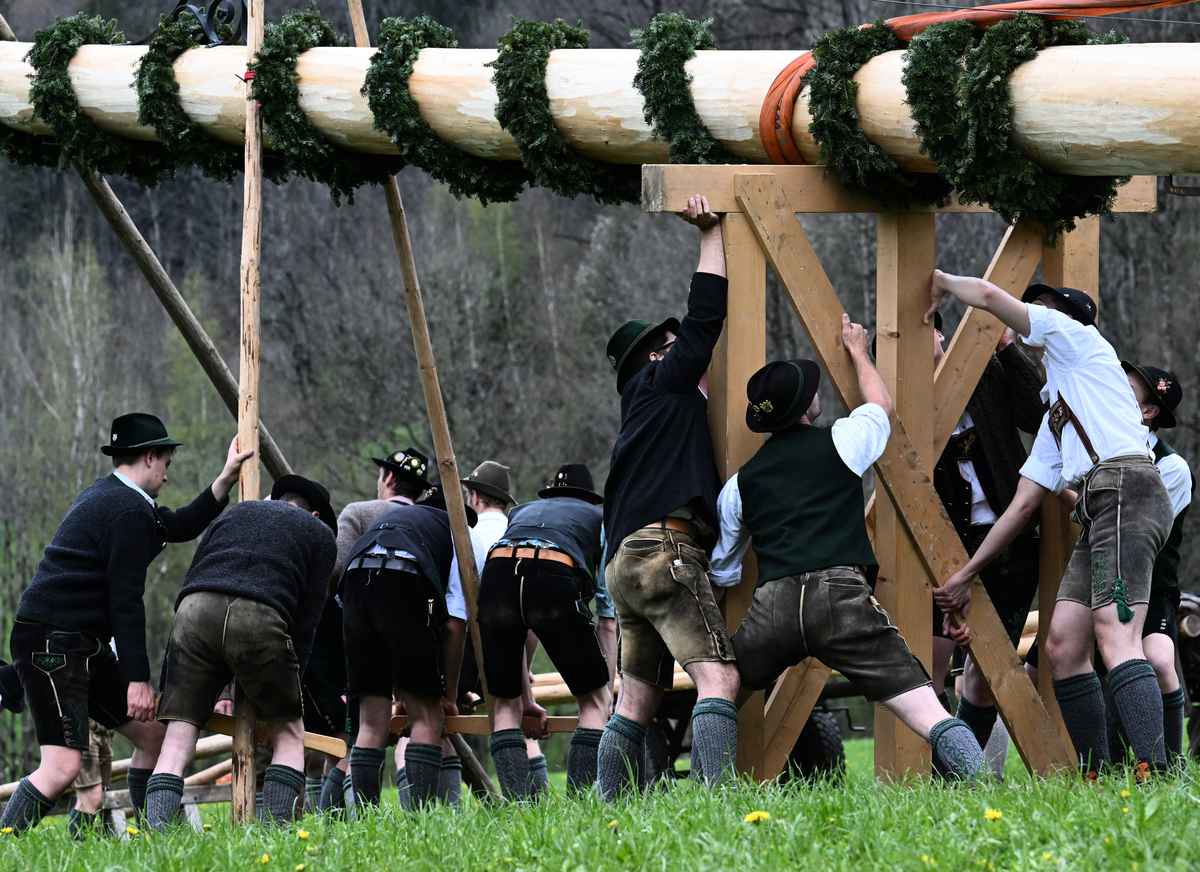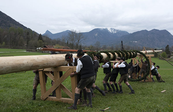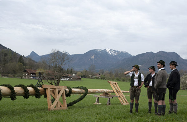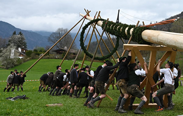 圖片顯示,5月1日,德國小村莊羅塔赫-埃根(Rottach-Egern)的民眾身著巴伐利亞傳統服裝,正試圖豎起一根新的五朔節花柱。#