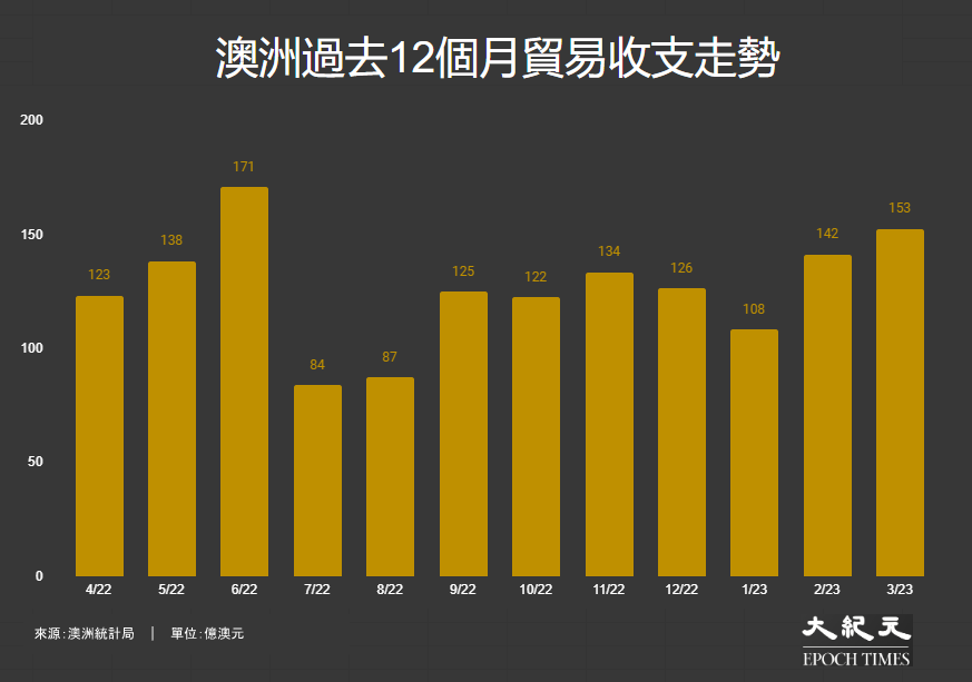 澳洲統計局於本周公布最新國際貿易數字,3月份經季節調整錄得貿易順差153億澳元,創自去年6月以來高位,市場預測127億澳元;2月為順差142億澳元,累積一年計報順差1,515億澳元,按年增加23.4%。3月,出口按月上升3.8%至593億澳元,過往12個月出口總數錄6,938億澳元;另進口按月上升2.5%至440億澳元,一年進口累計5,423億澳元。