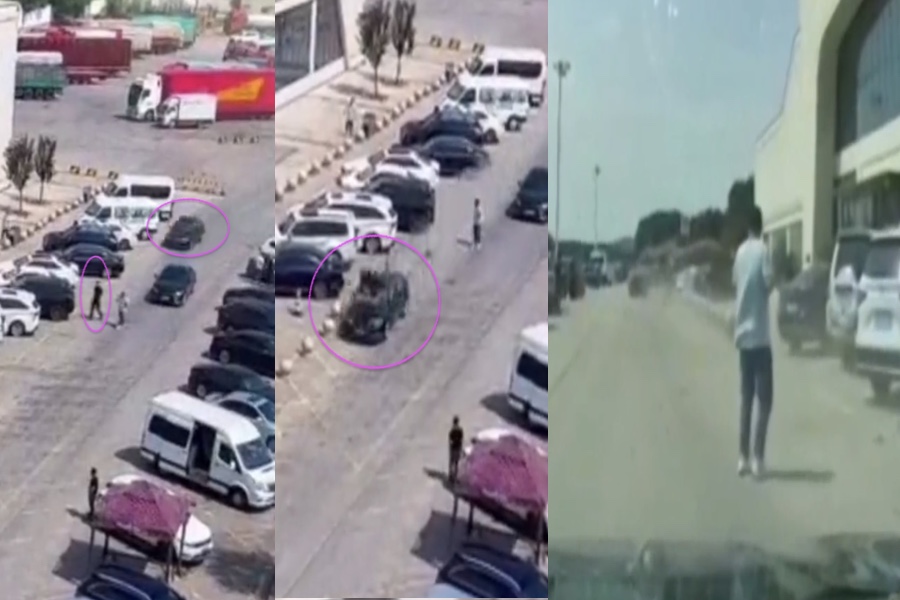 5月19日,大陸網絡熱傳一段影片顯示,在一高速路服務區,兩名路人正走著,突然遠處一輛黑色轎車高速行駛,一下子把其中一名身穿黑色上衣的路人撞飛,車子隨後又行駛多米才停下來。另一名身穿白色上衣的男子驚恐得雙手疑似抱住自己。