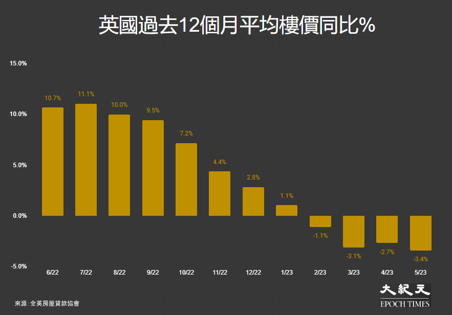 全英房屋貸款協會(Nationwide Building Society,NBS)於當地時間6月1日,公布最新英國多項樓市相關數據,5月份英國平均樓價錄得26.1萬英鎊,按年下降3.4%,創自2009年7月以來最大跌幅,經季節性調整後按月走低0.1%。