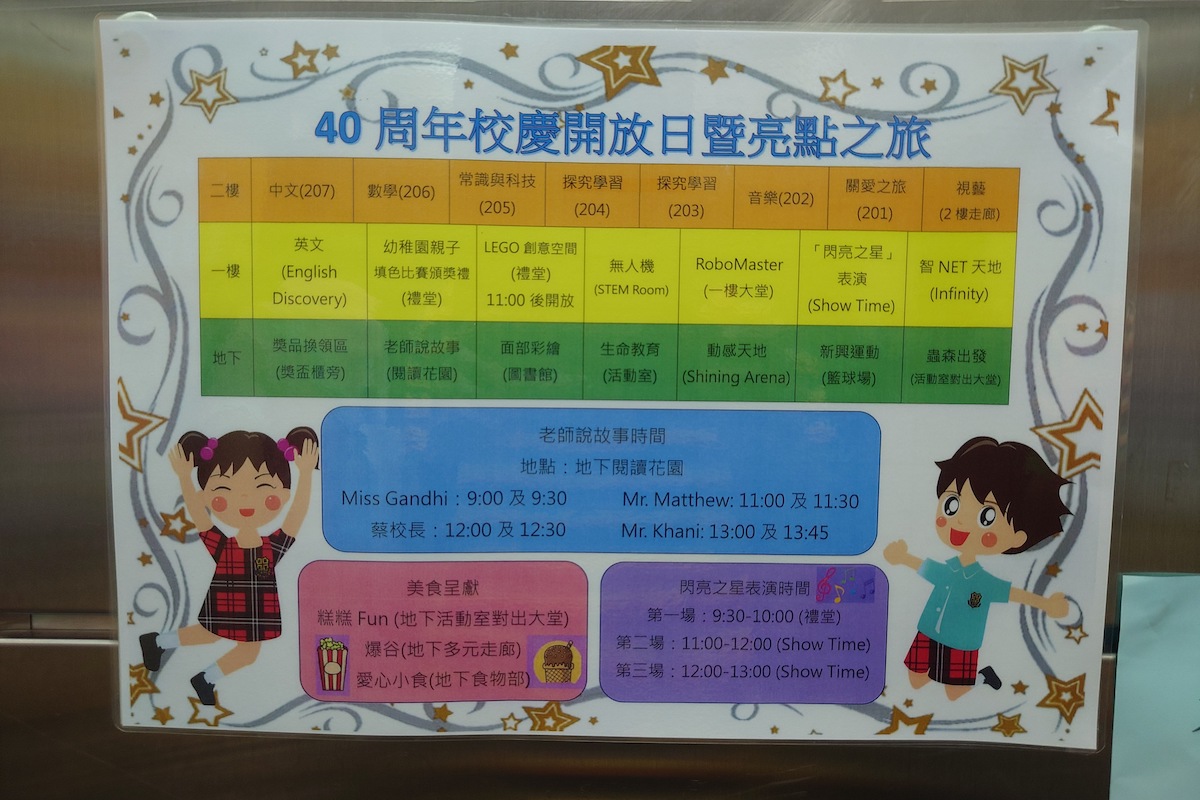 開放日的內容十分豐富,學校除安排了在三個不同時段學生不同的才藝表現,更有四個不同時段由校長及老師負責的講故事時間,同時開放了學校在地下、一樓及二樓的班房及特別室,讓公眾參與當中。例如在地下的圖書館、Shining Area (有蓋操場)及籃球場等,安排了面部彩繪、體適能及新興運動環節,一樓禮堂在親子填色比賽頒獎禮後,連同同層的STEM Room 及大堂等地方,安排為一個體驗 STEM 項目的專區,加上二樓課室中不同學科的學生成果展覽及工作坊示範,及暗藏在地下至二樓梯間的學校歷史展覽,是次校慶開放日不失為公眾全面認識學校的好時機!