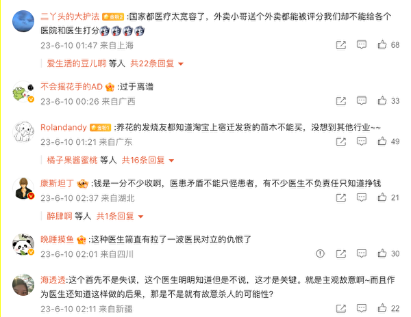 也有網民說:「外賣小哥送個外賣都能被評分,我們卻不能給各個醫院和醫生評分。」「離譜,一台手術這麼多人參與,可以讓一個醫生獨自篡改病歷和手術結果的麼,這讓病人如何信任醫護??」「我國醫院普遍存在的黑暗面,要根治真的太難,現有的控費措施看似節省大量醫保資金,實際上騰籠換鳥,劣幣驅逐良幣,醫藥代表照樣通過各種渠道給醫生回扣。」#