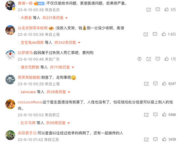 網民說:「不僅僅是技術問題,更是醫德問題,後果很嚴重。」「面子比人命重要?」「太可怕了吧!患者在醫生面前真的是很無助,只能任憑宰割。」「沒放入支架,錢倒一分沒少收啊,離譜。」