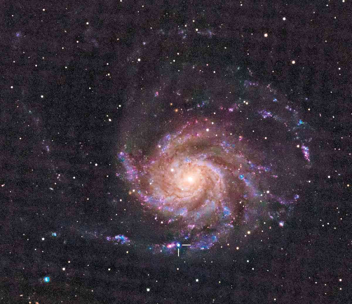 一顆恆星在距離地球僅2,100萬光年的近鄰星系中坍塌並演變成超新星爆炸,這為天文學家提供了一個難得的機會來實時觀察超新星爆發的精緻細節。這顆超新星亮度已經超過其宿主星系,預計在幾天內會達到亮度峰值,並可能在數月甚至數年內都能用業餘望遠鏡觀測到。