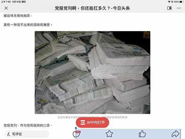 該文作者認為機關所訂閱報刊,很大一部份是「被訂閱」的,自己不會看。「一旦上級部門取消任務、逼訂閱的方式,那些高高在上、神秘兮兮的黨報黨刊,立馬連工資都發不下來,甚至倒閉停刊。」