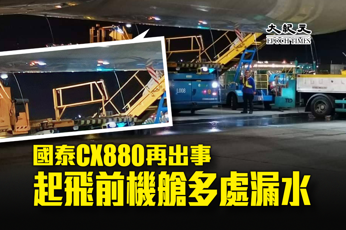 國泰一班CX880編號客機於上周六(24日)起飛前輪呔發生故障,釀成11人傷。涉事航班原定今日(26日)凌晨再啟程飛往美國洛杉磯,惟昨日(25日)深夜有機組人員發現,該客機有多處漏水情況,只好再次延誤。航空公司安排受影響乘客轉乘另一航班前往目的地。