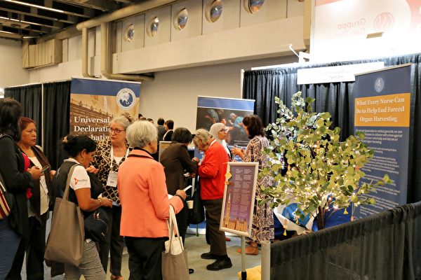 大會期間,許多參會者來到NAFOH的展位與工作人員交談。 Collins-Perrica說,有人第一次聽到活摘器官的消息,有人流淚,有人已經聽說過,「沒有一個人說不相信(活摘器官罪行在中國發生)」。
