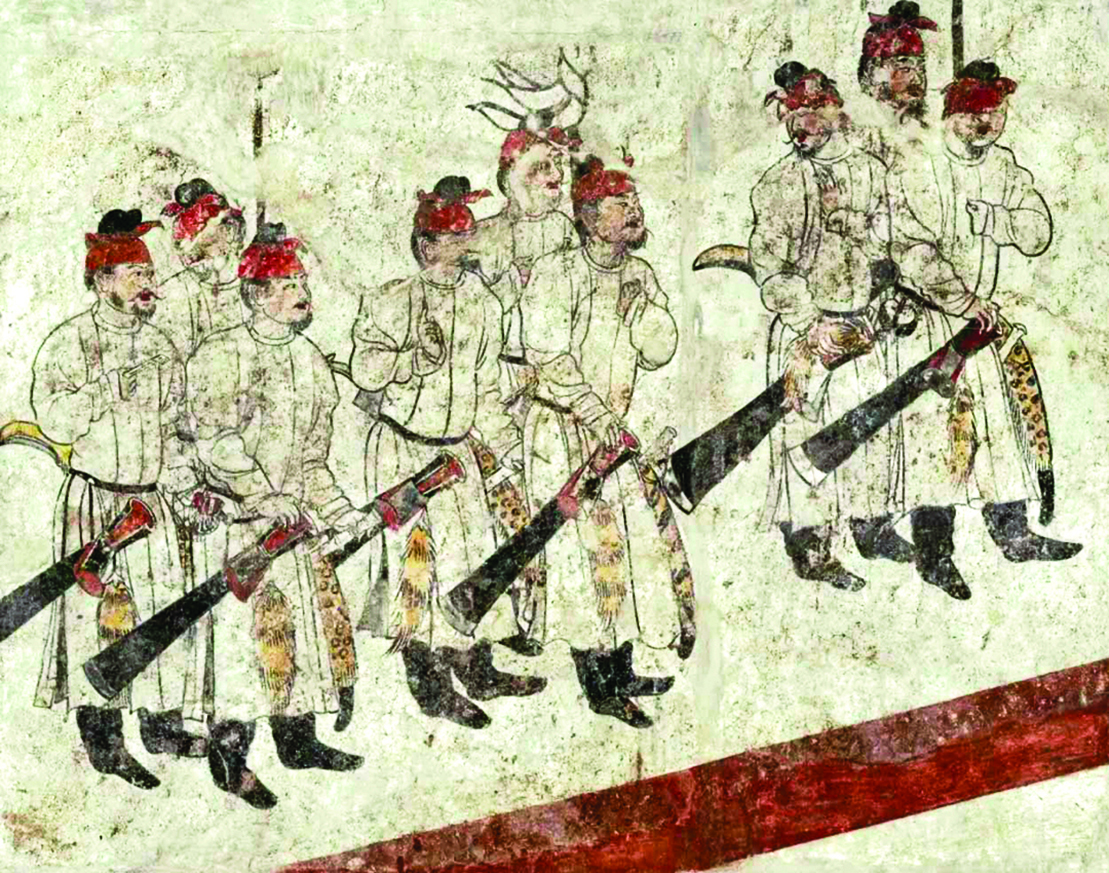 這種「軍容抹額」,在唐朝依然風行。《新唐書‧婁師德傳》記載:「後募猛士討吐蕃,婁師德乃自奮,戴紅抹額來應詔,高宗假朝散大夫,使從軍。」宋代儀衛中,將士的抹額根據顏色來區分官階和兵種,標識作用更為顯著。