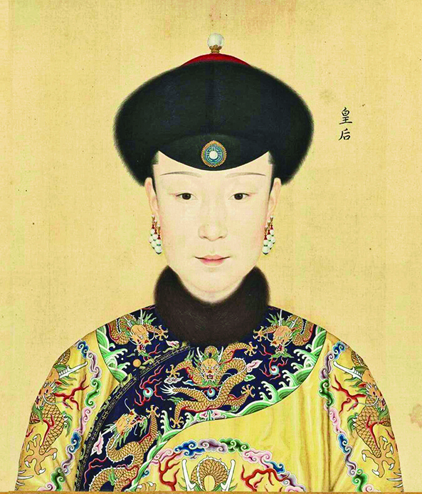 清朝的滿人女子,受到漢文化影響,穿戴的首飾趨於漢化。比如明代后妃的金約,同樣出現在清朝宮妃的畫像中。清代金約,由金箍和後部垂墜的串珠組成,由金箍節數和串珠串數體現品級高低。故宮藏品有一款金鑲青金石金約,金箍由八節金托組成,上下邊緣雕飾累絲雲紋,托中嵌青金戒面,兩節之間由東珠扣連結,整體造型穩重而豪華。