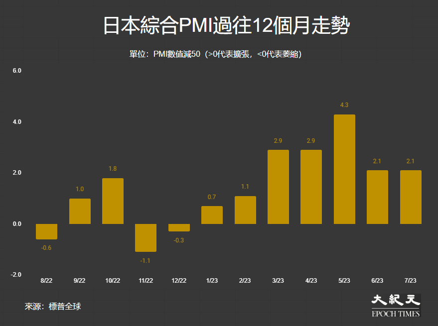 標普全球於今天(24日)公布最新日本綜合PMI(採購經理指數)初值,7月份錄得52.1,相比上月沒有變動,數值高於50的榮枯線,反映景氣處於擴張狀態。