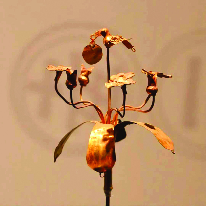 另外,甘肅武威出土過一件漢代的金頭花,也是步搖花的一種形態。此花以筒狀花莖做主幹,裝飾物分三層。底層是伸展出的四片彎曲的葉片,葉尖焊小環,可綴飾小物;中層則向外延伸出七條花枝,枝頭是或含苞、或盛開的金花;最頂端是一隻口銜圓片的小鳥。這枚金花步搖,以錘鍱、鑲嵌、焊接等工藝打造,做工非常精細。