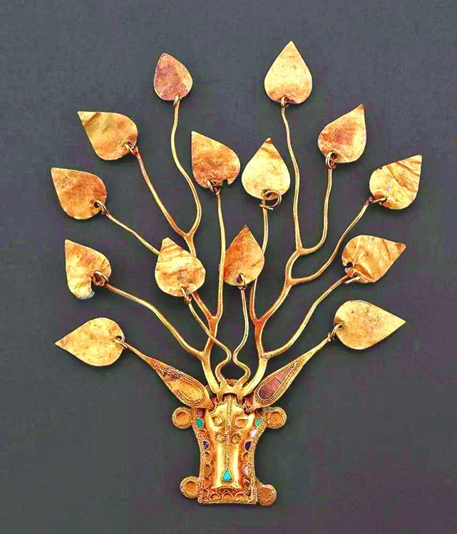 比如在阿富汗北部席巴爾幹,金丘6號大月氏墓發現了貴霜時期的一頂金冠。此冠底座是一條環形橫帶,帶上裝飾一圈六瓣花片,花瓣尖穿孔,各綴一圓形葉片。橫帶頂部,均勻排列五簇長條狀步搖花樹,樹上同樣固定著綴滿圓葉的六瓣花片。除當中一簇外,其餘四簇的樹梢上各棲二鳥,共計八隻。金冠不僅以步搖飾件為裝飾主體,而且和《續漢書》提到的「八爵九華」的步搖形制,非常接近。