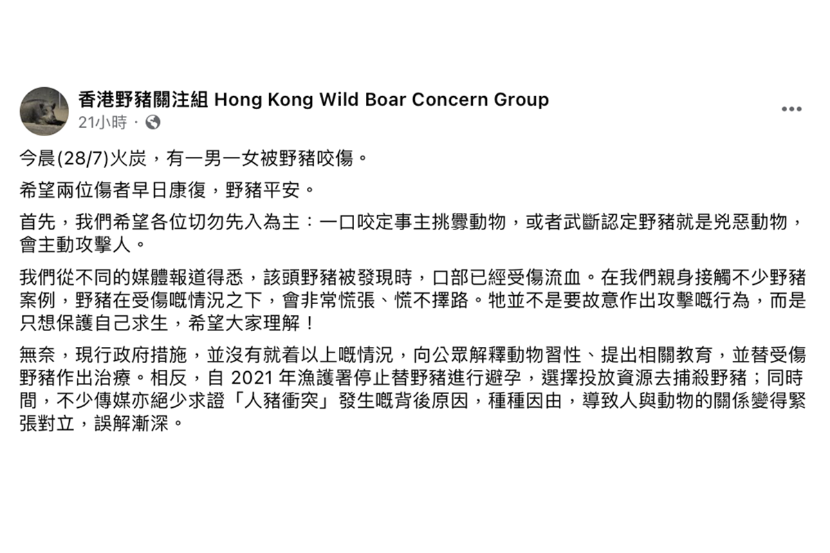 而香港野豬關注組黃豪賢回覆《香港動物報》時亦強調,野生動物受傷時需要的不是撲殺,而是醫治及絕育放回山上,這才是人和野生動物共存之道。