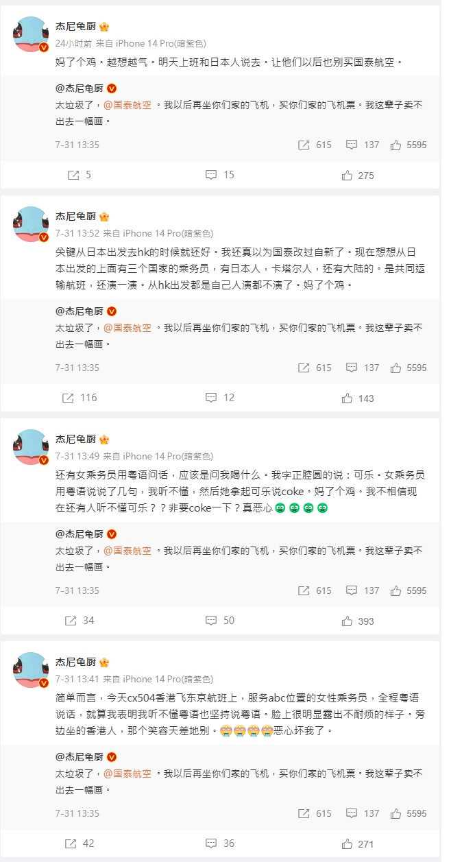 一名網名為「杰尼龟厨」的大陸網民昨日(31日)在微博貼文表示,昨日乘搭國泰航空CX504班機由香港飛往日本東京,期間一名負責服務他所乘座區域的女性服務員全程以粵語說話,即使「杰尼龟厨」表明聽不懂粵語,對方仍堅持以粵語對答,更指控對方服務其他香港人乘客時的笑容「天差地別」。