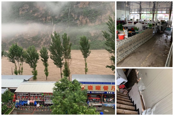 他說:「31號是最恐怖的一天,餐廳的東西都全部沖走了,冰櫃、桌椅、板凳,一件沒撤,根本就撤不出來。我撤到上面後,眼看著水往上漲,很快104國道全是水,我們賓館挨著路邊,水進到1米多深,我這賓館是高處,下邊都進到2米多深,3米深的水。」