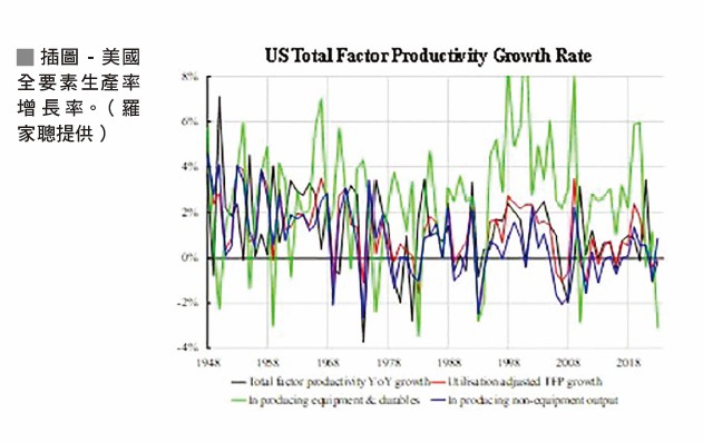 三藩市聯邦儲備銀行的 John G. Fernald 對數據進行了一些調整和細分。附圖顯示了根據資本和勞動力利用率調整後的原始全要素生產率。調整後的數據還分為設備和非設備。令人驚訝的是,測算的全要素生產率總增長率在過去一二十年(2021 年除外)並沒有顯示出特別高的增長。事實上,其趨勢增長低於20 世紀90年代末和21世紀初。所有子序列都呈現出類似的下降趨勢。