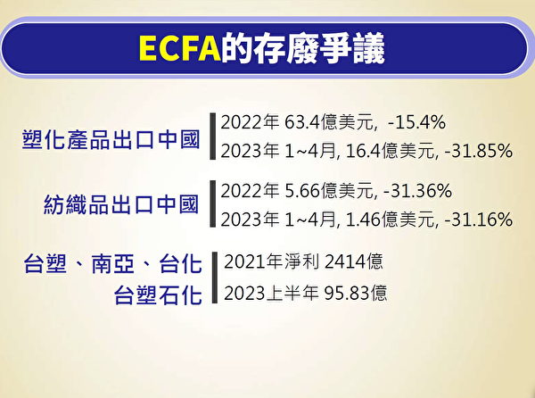 他以石化業為例提到,台灣出口到中國的塑化產品,在2022年只有63.4億美元,已經很少了,今年還在繼續衰退中;而輸中紡織品在2022年剩下5.66億美元,今年1至4月也只有1億多美元。我們來看一下台塑集團業績很慘淡,台塑4寶在2021年還賺了2,414億台幣,但今年到上半年的營利只剩下95億多台幣。