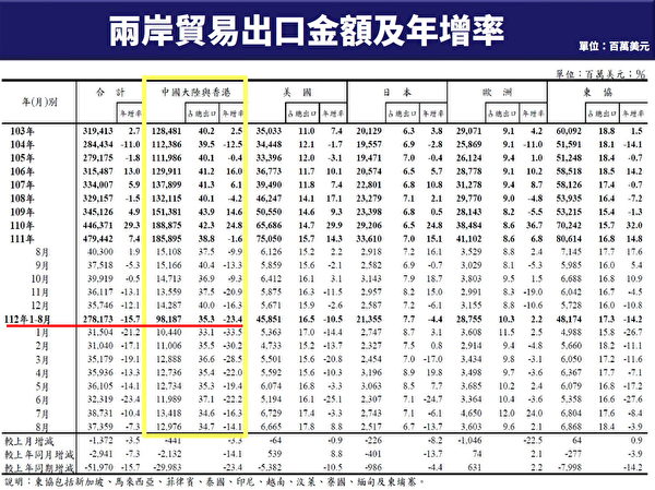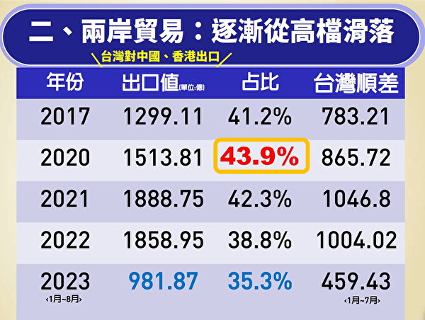 中國的供應鏈被切斷了以後,兩岸的貿易逐漸從高檔滑落。在2020年台灣出口到中國,它的佔比最高到43.9%時、順差是865億美元,2021年的佔比開始下滑到42.3%,到2022年第四季開始快速下滑,今年1月到8月的出口值剩下981億美元,大概佔比降到35.3%。