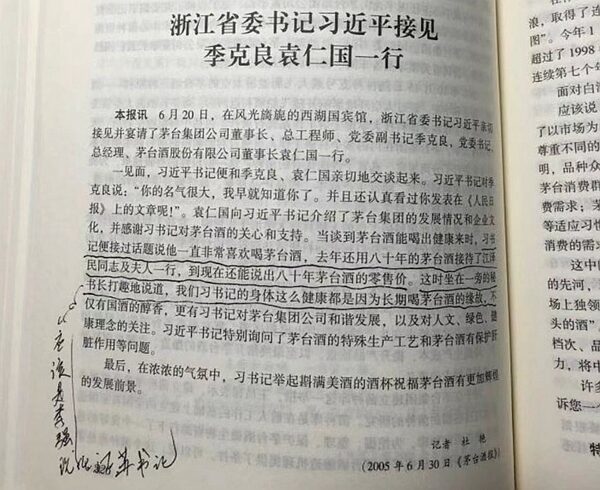當中記述:6月20日,時任浙江省委書記習近平在西湖國賓館接見並宴請了茅台集團董事長、總工程師、黨委副書記季克良,黨委書記、總經理、茅台酒股份有限公司董事長袁仁國一行。袁仁國向習介紹了茅台酒的發展情況。在談到茅台酒能喝出健康來時,習接過話說,他一直非常喜歡喝茅台酒,去年(2004年)還用八十年的茅台酒接待了江澤民夫婦一行,到現在還能說出八十年茅台酒的零售價。