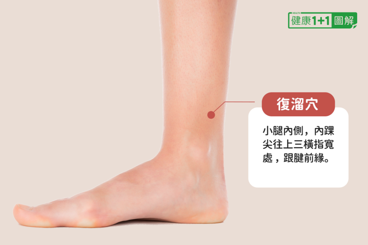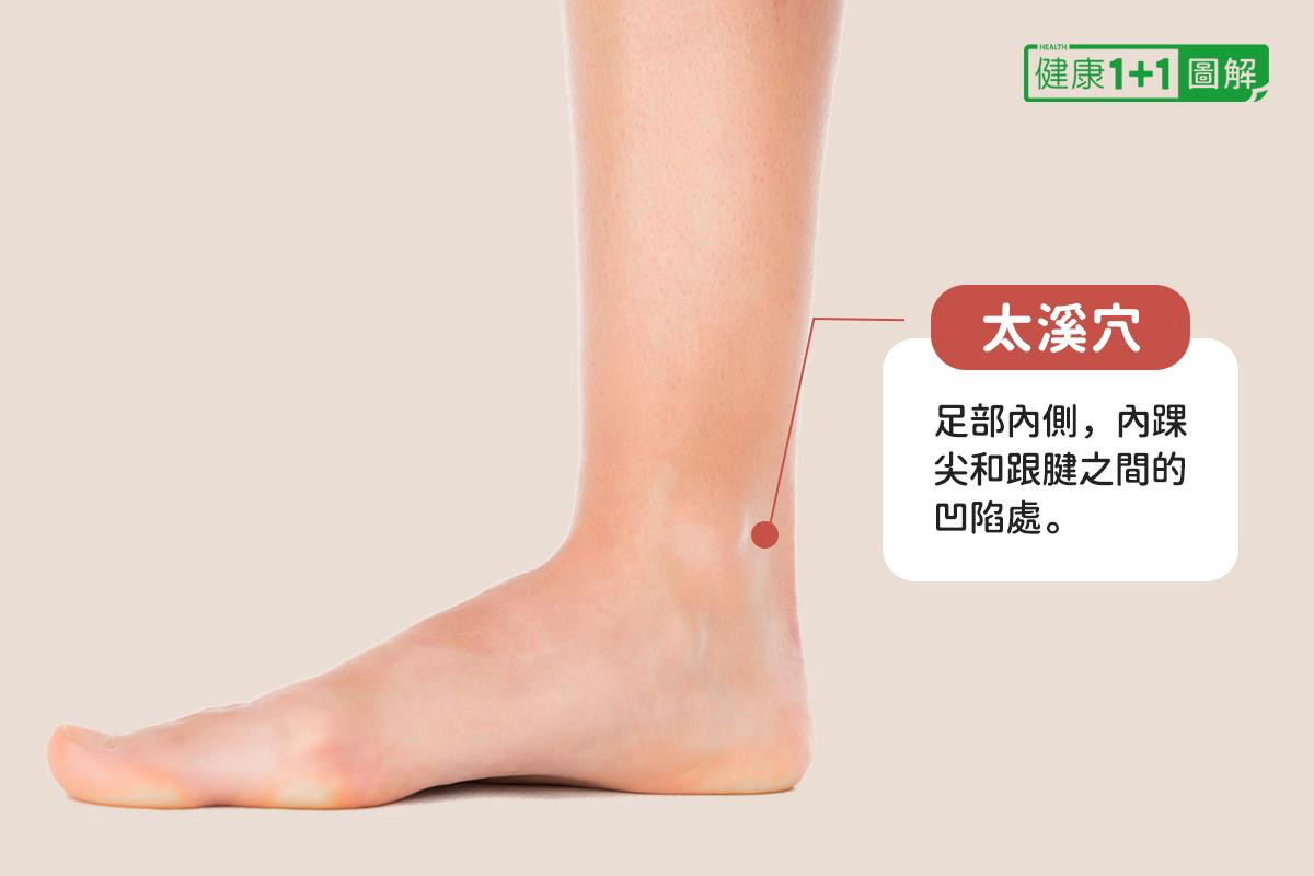 太溪穴在足內踝後側的凹陷處,復溜穴位於太溪穴往上兩寸(約三指寬)處,是很好的補腎穴道。反覆上下按揉這兩個穴位,有益於養護腎臟。