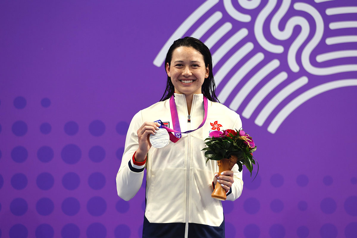 何詩蓓在女子50米自由泳決賽,以24秒34,與大陸的張雨霏0.08秒之差游出銀牌,本屆參與的所有項目都奪牌而回,累積2金1銀2銅。