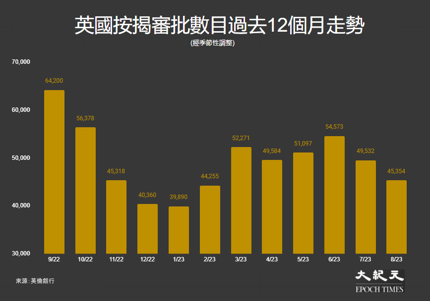 英倫銀行於當地時間9月29日,公布最新多項借貸數據,8月份經季節性調整後的按揭(作買樓用途)審批數目為45,354宗,高於市場預期的45,000宗,上月錄得49,532宗。審批數目可作未來數月按揭借貸方向的參考。