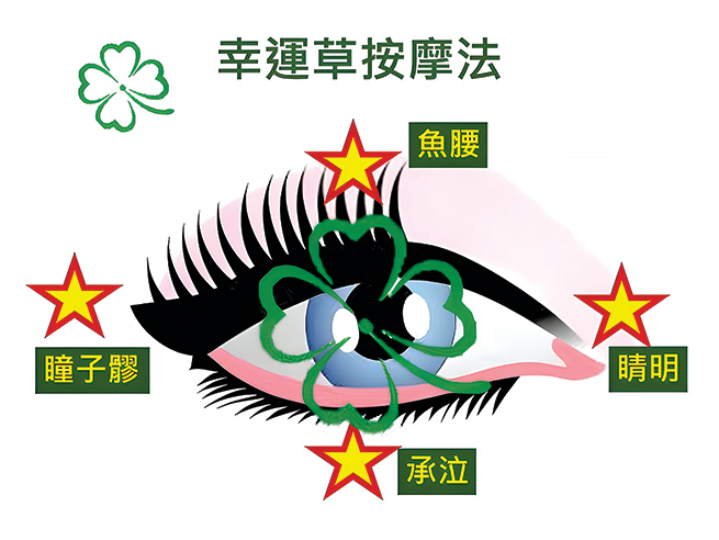 4. 進行幸運草按摩法,按摩眼周的睛明穴、魚腰穴、瞳子髎穴和承泣穴,以指腹逆時針或順時針輕輕點按,有助於放鬆眼周肌肉。