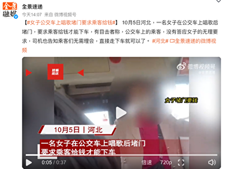 綜合陸媒報道,10月5日,河北張家口一女子乘坐巴士時,突然拿出手機開始唱歌,並向乘客索費。