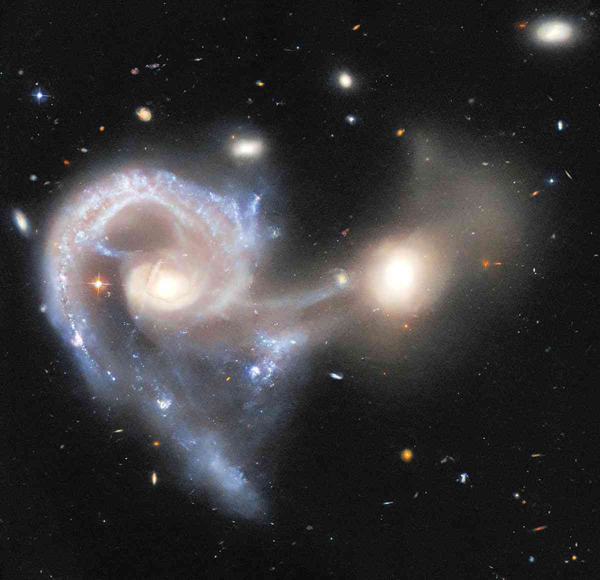 美國國家航太局(NASA)的哈伯太空望遠鏡(Hubble Space Telescope)拍攝到一張奇特的圖片。它呈現兩個不同類型的星系正在發生碰撞與合併的過程。