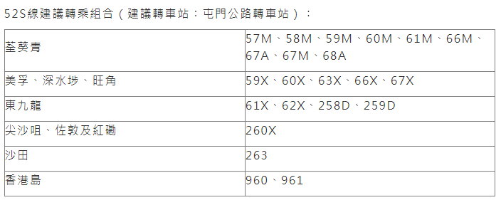 乘客由指定九巴路線轉乘14S線及52S線,會分別享1元及最多8元的轉乘優惠,詳情見下表: